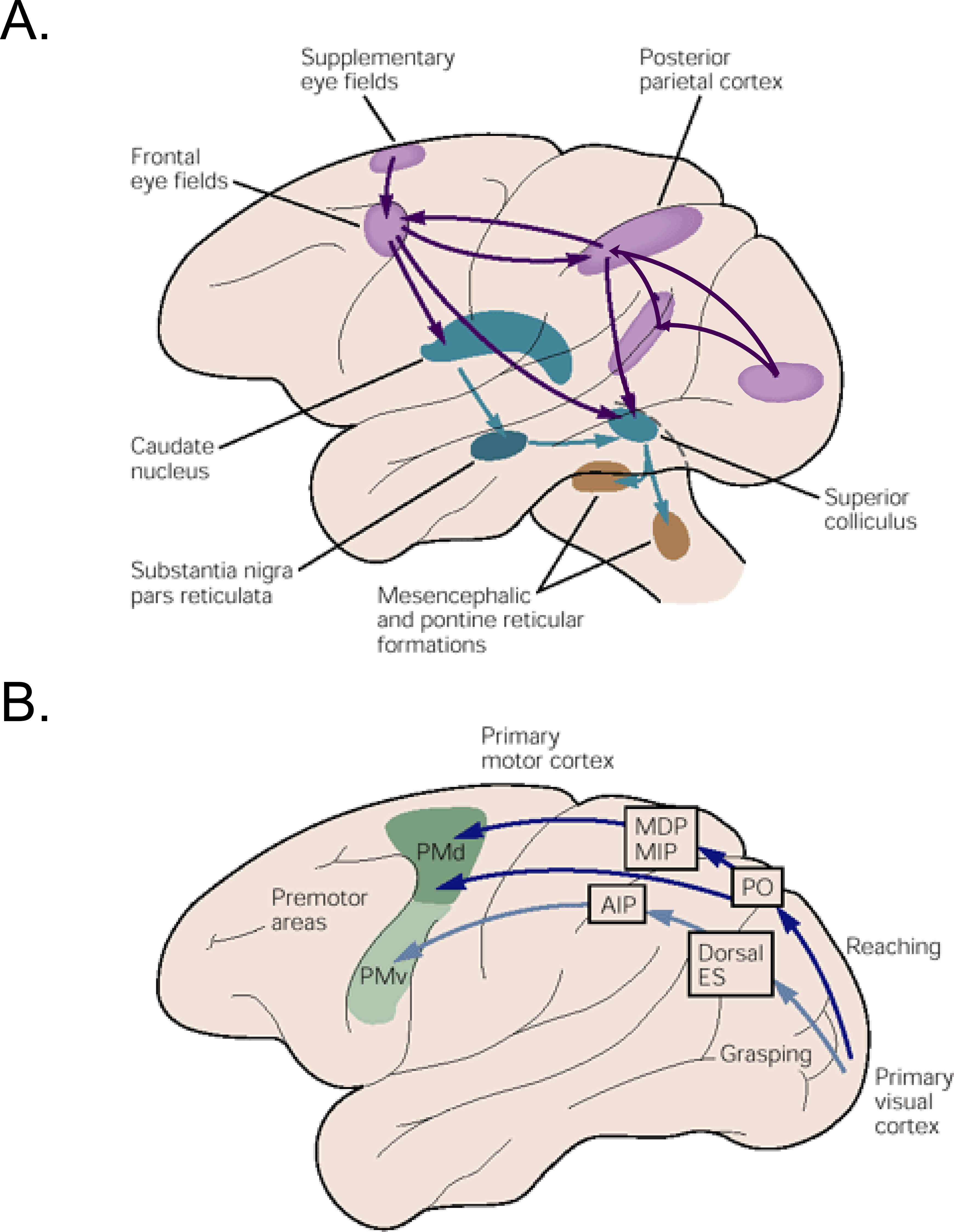 A) The cortical (pink), sub-cortical (blue) and mid brain regions (brown) are thought to be involved in goal directed saccadic eye movements. Frontal eye field is one of the important oculomotor structures that plays an important role in initiating saccades by directly exciting the colliculus and indirectly releasing it from suppression imposed by the substantia nigra in the basal ganglia. B) Separate cortical regions in the parietal and premotor areas are involved in carrying out visuomotor transformations for reaching and grasping objects. Figures taken from (Kandel, Eric. R., Schwartz, James H., Jessell, Thomas M. 2000).