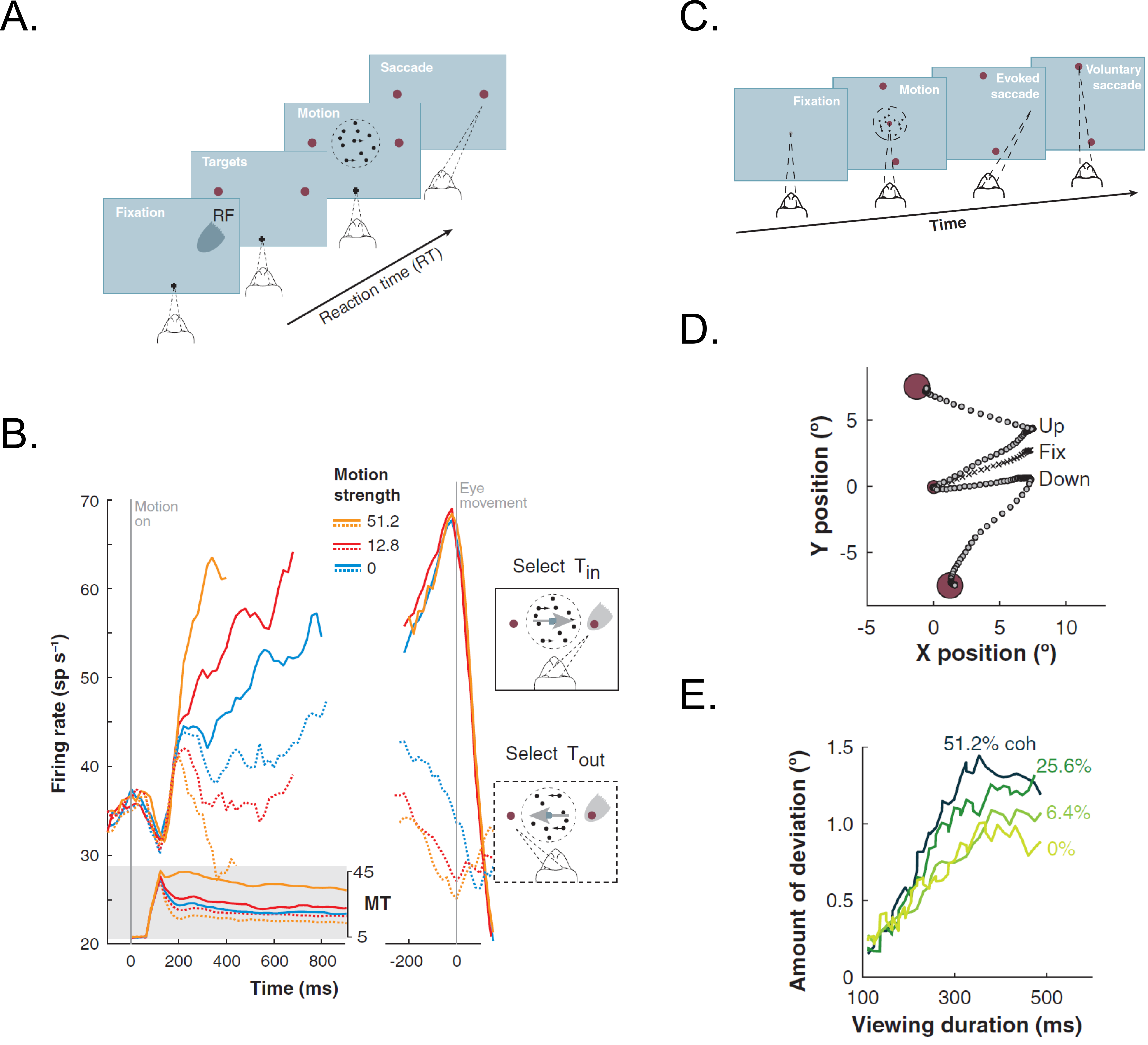 A) Choice-reaction time version of the direction discrimination task. In this task, the macaques had to report the direction of the dynamically moving dots by making saccadic eye movements to the appropriate target location whenever ready. B) The average response of LIP neurons approximates the integral of a difference in firing rate between the MT neurons (shaded insert) with opposite direction preferences during the decision formation time. The indicated response was grouped based on motion strength and direction of choice. They are aligned on onset for random-dot motion (in left) and saccade onset (in right). C) Interrupted direction discrimination task. In this task, the motion viewing is interrupted by microstimulating FEF to evoke a saccade. Thus, the macaque had to make a second, voluntary saccadic eye movement to the target in periphery to indicate his decision. D) Example of eye movement trajectories when FEF was microstimulated during the fixation and while viewing upward and downward motion. The induced saccades deviated towards the direction of subsequent voluntary eye movements. E) The average amount of deviation depended on motion strength and viewing time. These results show that the information evolves over time in the oculomotor system and the outcome of the decision process. Figure taken from Gold & Shadlen 2007.
