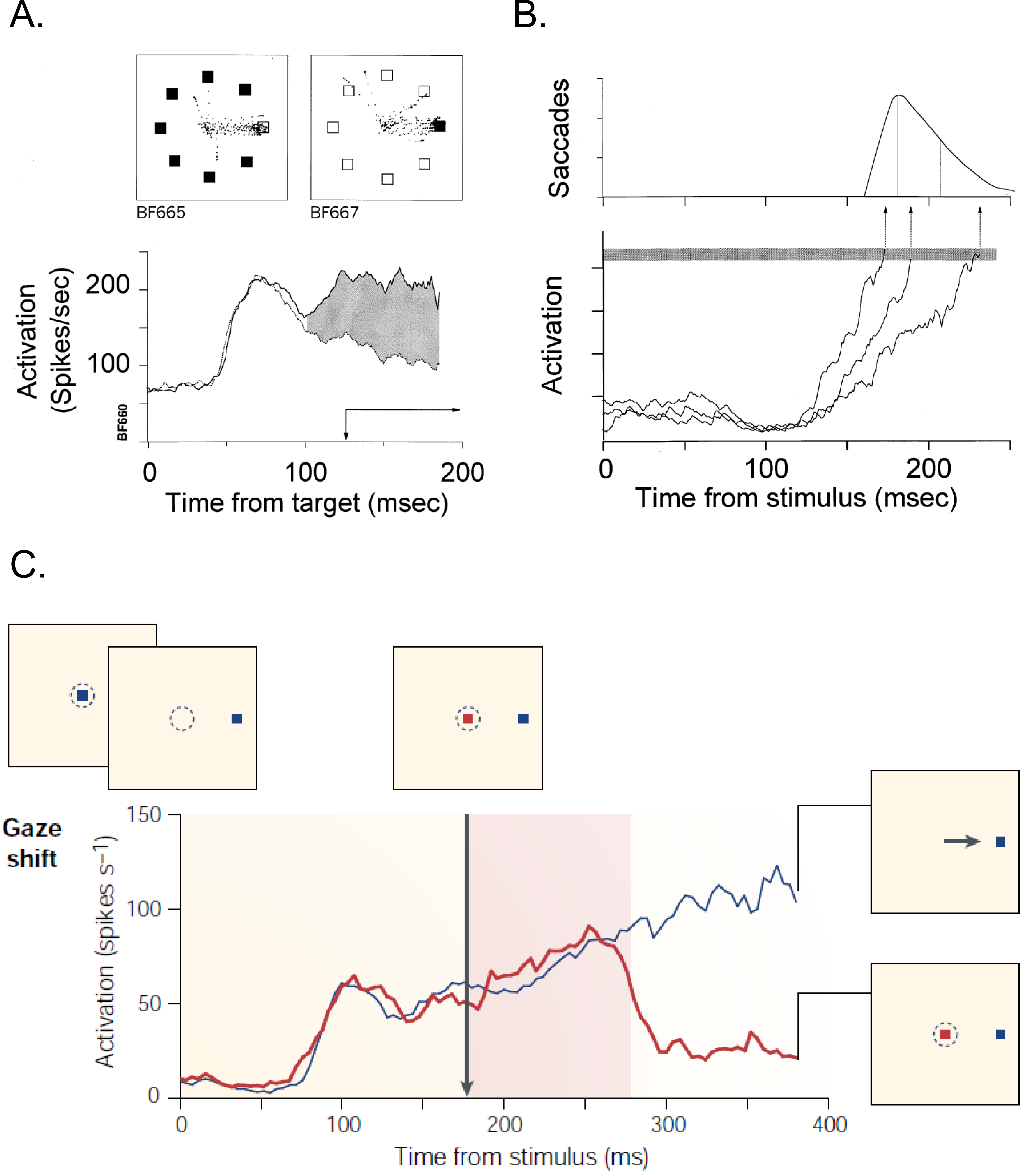 A) The time course of activation of a single FEF neuron, when the target (solid line) or a distractor (dotted line) was presented in the receptive field during a search task (as shown in panel above). The filled region indicates the interval when the two curves were significantly different. This result reveals that FEF plays an important role in target selection. B) The activity of movement-related neuron is related to the variability in saccade latency. It is accounted for by the time it takes to reach a fixed threshold.(Schall & Hanes 1998). C) Plots compare the rapid change in activation of neuron for different conditions by exerting control through cancelling a planned movement. (Schall 2001)