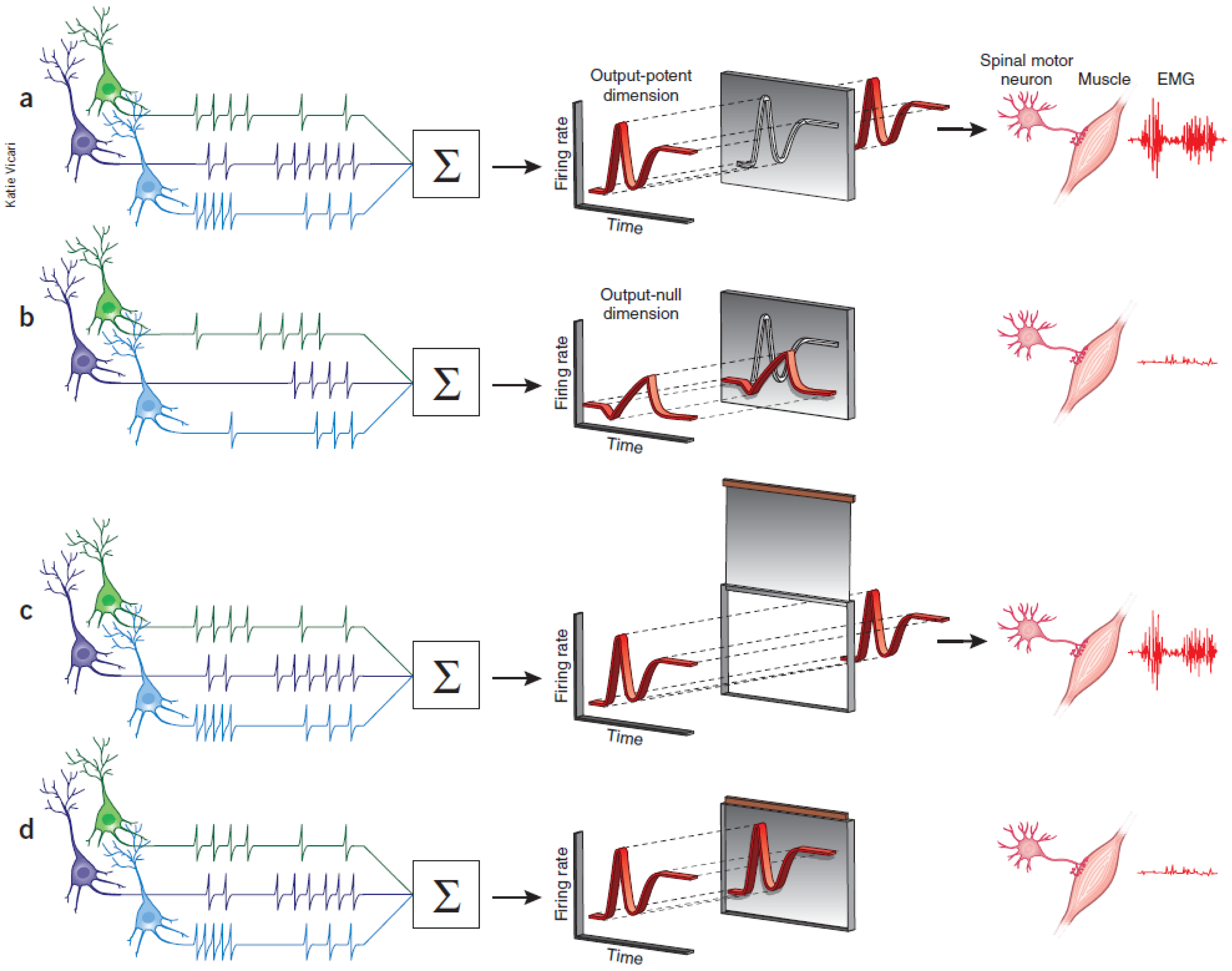 A highly schematic illustration of computational (a,b) and structural (c,d) architectures that could gate the flow of information in different cortical and sub-cortical areas. (a) Only certain patterns of motor cortical activity effect appropriate muscle groups (b) Different patterns of descending cortical activity cancel out and have no effect on downstream effectors. The cortical areas can act as a filter allowing only some pattern of neural activity that lie in an output-potent dimension to reach the periphery. (c) In the motor gating hypothesis, irrespective of the firing pattern of different input areas, if the structural gate is open, motor commands reach appropriate muscle groups. (d) Similarly, the neural activity cannot affect the muscle group if the structural gate is closed. Figure was taken from Sanger & Kalaska 2014.