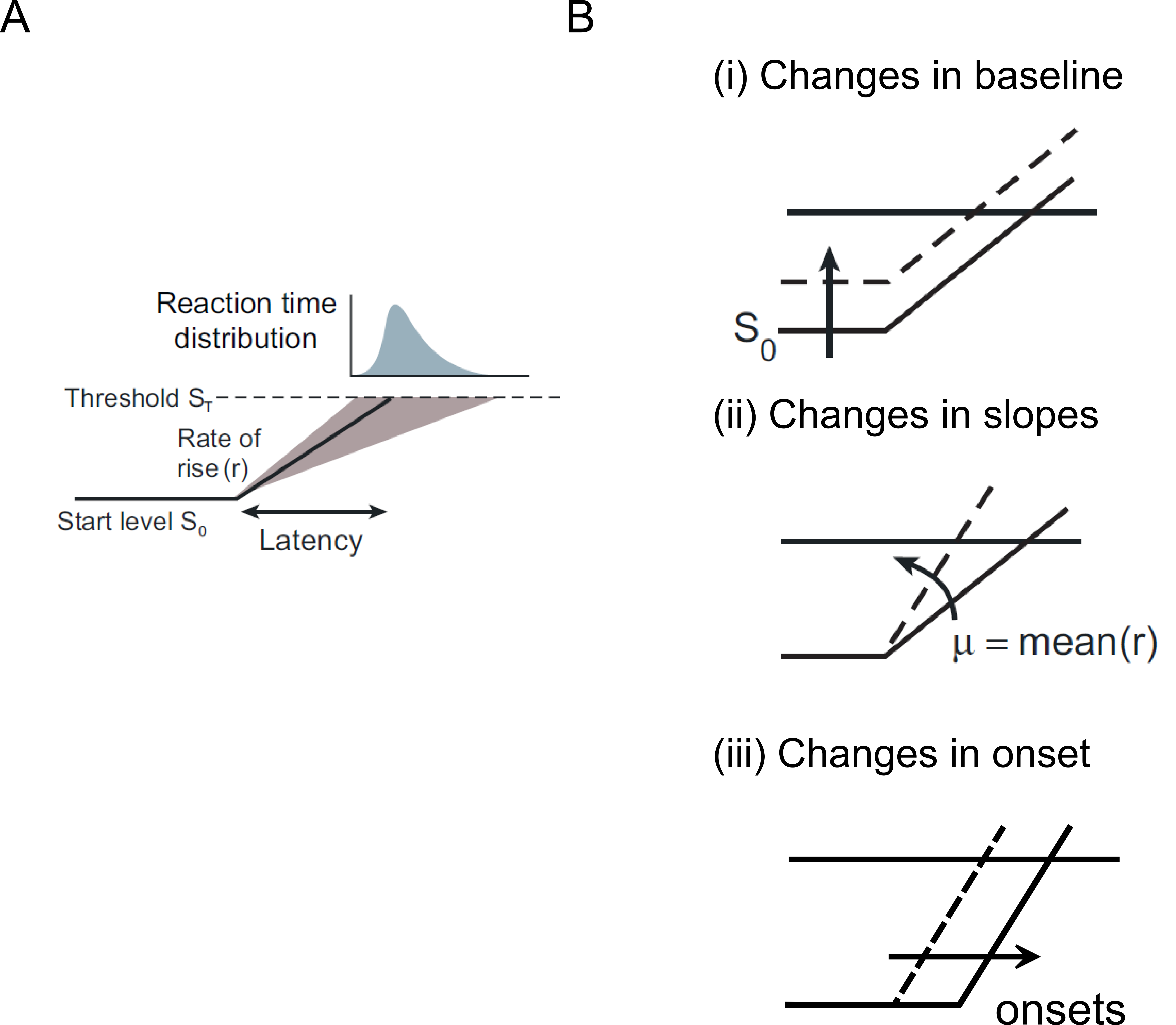 A) Response of the system is initiated when a DV or the preparatory signal reaches a fixed threshold (ST). The rate at which the signal rises (r) is predictive of reaction times. The distribution of predicted RT is skewed. B) The model predicts systematic changes in reaction time with changes in (i) baseline, (ii) slope and (iii) onsets. (Figure taken and modified from Gold & Shadlen 2007).