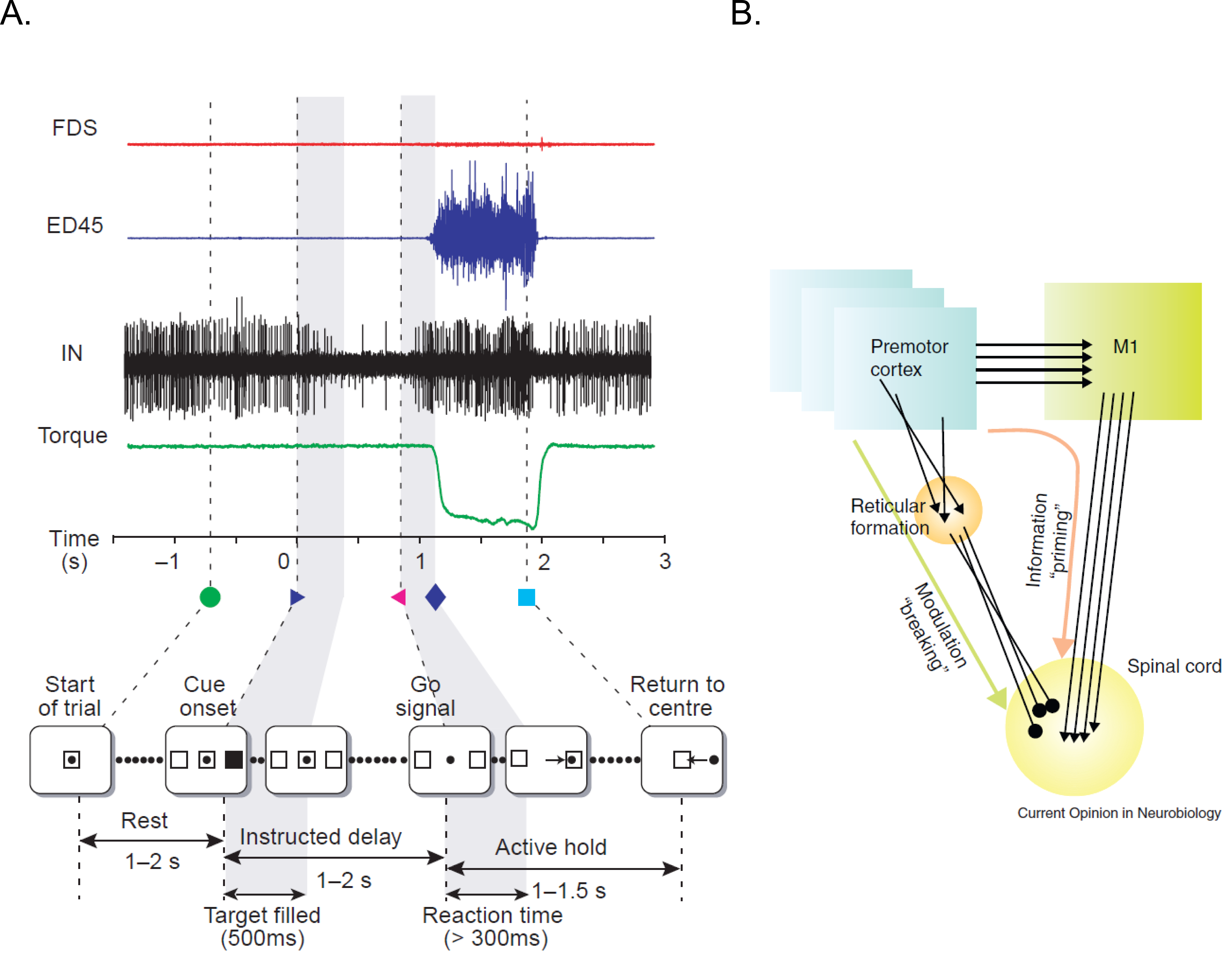 A) Example of a single instructed delay trial is shown at the bottom panel. Traces (from top) show activity of two different muscle groups (Top: flexor digitorum sublimis and extensor digitorum). Shown also is the activity of interneurons and torque signal. During the delay period, the firing rate of this unit decreases, with no accompanying torque deflection or EMG activity of either muscle. B) The illustration represents a possible model to account for the priming and braking mechanisms in spinal cord circuitry during movement preparation. Figures have been taken from Prut & Fetz 1999 and Cohen et al. 2010.